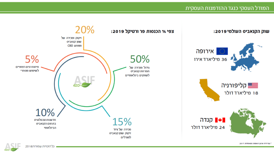 בכל הנוגע ליעדי שיווק אסיף-420, כרוב החברות בתחום כיום, מדברת בעיקר על אירופה כשוק היעד העיקרי. נכון, במהלך 2018 שמענו רבות על ייצוא לארה"ב ולקנדה, עד שמתישהו נפל למישהו האסימון שייצוא לארה"ב לא אפשרי (בגלל החוק הפדרלי) וייצוא לקנדה הוא לא ראלי, שכן גם עם דיווחים נקודתיים רגעיים על מחסור, עדיין יש בה תעשייה מפותחת שמגמדת את ישראל. ואגב, קנדה, שאסיף-420 נתנה לה שווי שוק של 24 מיליארד דולר ל-2019? הערכה ראשונית לאור המכירות שלאחר הלגליזציה, מדברת על שוק של קצת מעל מיליארד דולר בלבד.