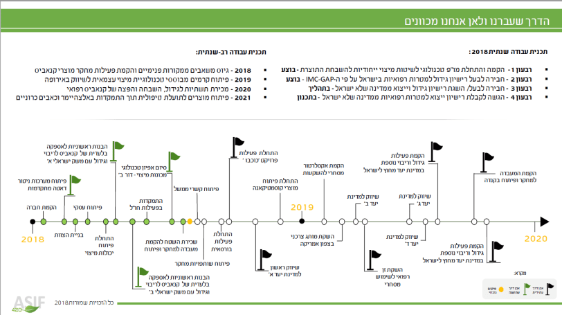 כל הבאז הזה הזכיר לי מצגת של אחת מחברות הקנאביס שנתקלתי בה בקיץ האחרון ושעשויה לשפוך אור על פרקטיקת הפרחת החלומות שהתפתחה בתחום. חברת אסיף-420 שהתמזגה עם השלד הבורסאי של קמן קפיטל, היא למעשה חברה בת קצת יותר מחצי שנה שעיקר פעילותה עד כה הייתה בעיקר הרבה יחסי ציבור. כאחיותיה לתחום, אסיף-420 פיזרה הבטחות גדולות: 40 טון שהוזמנו מקנדה, הודעה על חתימת הסכם יצור וייצוא במדינה באפריקה, הבנות לחתימה עם מדינות באירופה ומה לא.