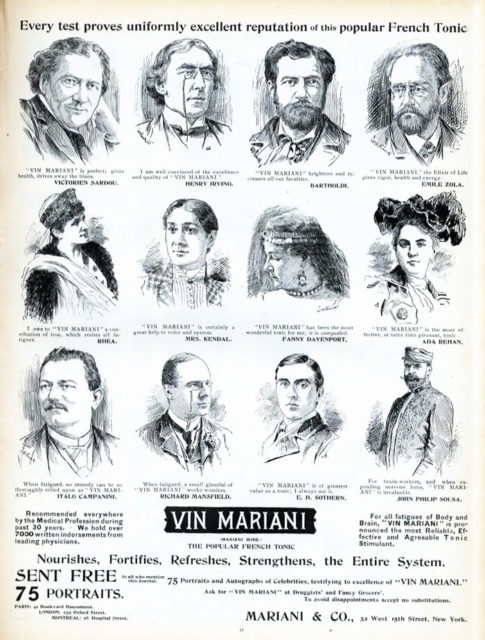 אחד היישומים המעניינים של הקוקאין אז, היה הערבוב שלו במשקאות ובעיקר ביין. אחד המפורסמים בהם "יין מריאני" שהמציא הכימאי הצרפתי אנג'לו מריאני ב-1863 יין מריאני שווק כמזור לגוף ונפש מותשים והפך למוצר מבוקש בין-לאומי בעיקר בקרב ידועני התקופה, כמו ארתור קונאן דויל, ז'ול וורן ותומס אדיסון. מריאני עצמו זכה למדליית זהב מהאפיפיור ליאו ה-13 שנטען שנשא על גופו פלאסק קטן של המשקה.