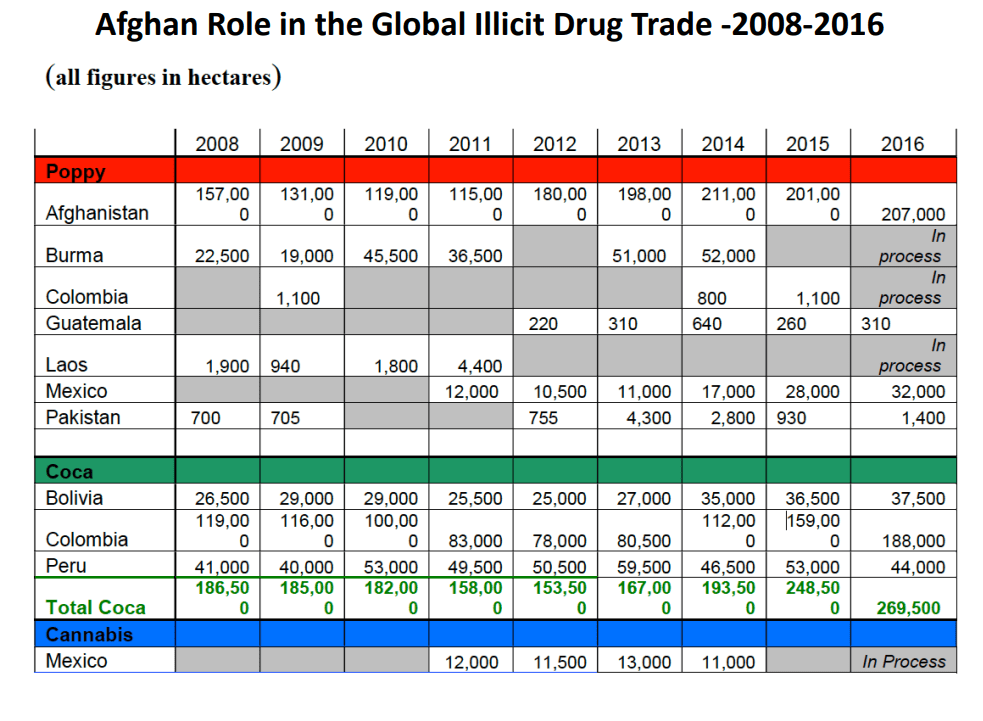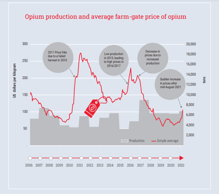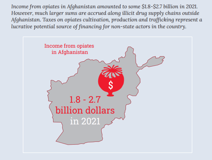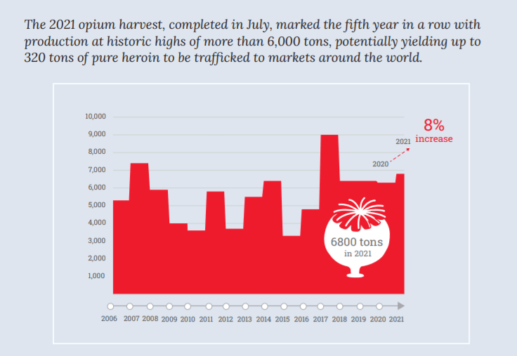 כל מי שניסה אי פעם לחסל את תעשיית האופיום האפגנית, הטאליבן, האו"ם, האמריקאים, נאט"ו, או ממשלת אפגניסטן החופשית, אף אחד מאלו לה היה יכול לה. למרות כל המאמצים, אפגניסטן נותרה אסם האופיום וההרואין של העולם. לפי דו"ח הסמים השנתי האחרון של האו"ם, אפגניסטן מייצרת כ-85% מהאופיום המיוצר בעולם, ומספקת את הצריכה של כשמונים אחוזים מצרכני האופיאטים הלא חוקיים בעולם. הדו"ח מציין, שבשנת 2021 יוצרו באפגניסטן מעל ל-6,800 טון אופיום, שמייצגים פוטנציאל יצור של כ-320 טון הרואין טהור. לפי האו"ם, השווי של כל זה עבור אפגניסטן באותה שנה הסתכם בטווח שבין 1.8 ל – 2.7 מיליארד דולר. זה השווי בייצוא מאפגניסטן כמובן. אם בוחנים את עליית מחירי האופיום וההרואין לאורך שרשרת הערך שמחוץ לאפגניסטן, עד שהם מגיעים לשווקי היעד, אז כבר השווי קופץ פי כמה וכמה מעלה, אבל מזה אפגניסטן לא ממש רואה הרבה.
