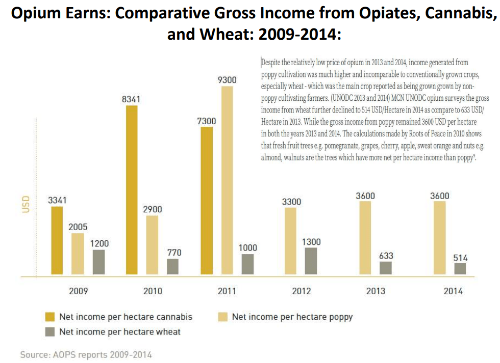 לשני האחרונים, פנטניל וקארפנטניל יש "יתרון" עצום, שהוא גם הסיבה שהופכת אותם לכל כך מסוכנים וקטלניים במגפת האופיואידים בארה"ב. אם נחזור לרגע לנוסחת ההכפלה ההיא, אז ביחס למורפין, שני אלו חזקים פי 50 ואף עד פי 100, בהשוואה של גרם לגרם. אם כי זמן ההשפעה שלהם נחשב לקצר יותר מזה של הרואין. בכל מקרה, את העיסוק בשני אלו ובנזק שהם יצרו במגפת האופיאטים בארה"ב, אני משאיר לסדרת פרקים אחרת אותה אני מתכנן בנושא. עכשיו הגיע הזמן שנחזור לאופיום ולהרואין האפגני ולמקום החשוב שלהם בכלכלה האפגנית.