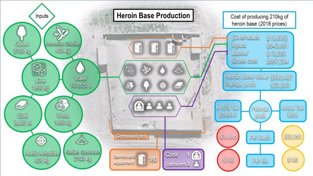 כל זה לפני שדברנו על הכוח המשחית של תעשיית האופיום על מרכיב שלטוני ועל כך שרוב ההכנסות של התעשייה, כלל לא מניבות מיסים והכנסות למדינה האפגנית. וזה לא שלא קיימת מערכת מיסוי על תעשיית האופיום. דוח משרד האו"ם לסמים ופשיעה משנת 2018, העריך שרק מהמיסוי הלא רשמי על גידול אופיום, הניבו גורמי שלטון ובעלי כוח באפגניסטן 29 מיליון דולר רק באותה שנה. מהסכום הזה כ-18 מיליון דולר הלכו לקבוצות כוח שונות שפעלו נגד הממשלה אפגנית. 6 מיליון דולר הגיעו לבעלי כוח מקומיים, או בשם האחר, לראשי השבטים. עוד 3 מיליון דולר הגיעו לפי ההערכה לכיסים של פקידי ממשל ומשטרה.