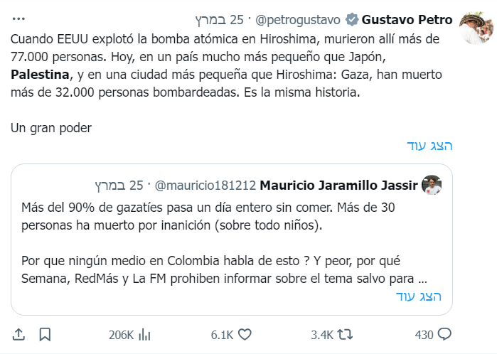 נתחיל ונאמר, גוסטבו פטרו אנטישמי. כן, אנטישמי על מלא. מדוע אני טוען כך? כי ובכן, מאחר ואני עוקב אחריו מזה זמן מה, ראיתי איך לאורך המלחמה חשבון ה-X (טוויטר) שלו, גם אם לא מתופעל על ידו ישירות, הפיץ תעמולה שהיא מעבר לאהדה לפלסטינים. שקרים, תעמולת כזב, ובעיקר עלילות דם אנטישמיות במלוא מובן המילה. והוא עצמו? ובכן, הרטוריקה שלו הייתה גיבוי מלא לחמאס במסווה של התנגדות לכיבוש "ורצון לקדם הפסקת אש ושלום". אנטישמי.